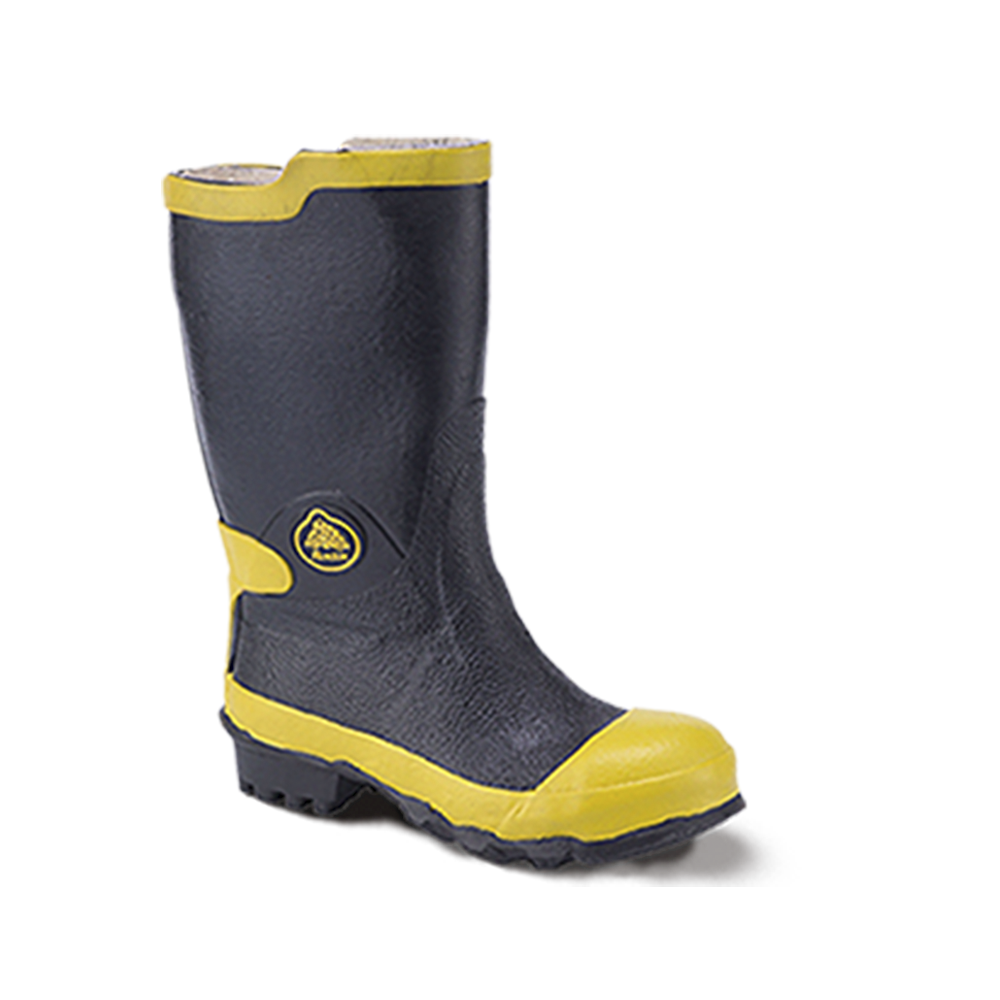 Bota de goma vulcanizada, fabricada en compuestos basados en mezclas de elastómeros naturales y/o sintéticos, con buenas propiedades físicas y mecánicas, que incorpora punta y plantilla de acero. Rebaje en pantorrilla para un mejor caminar, refuerzo en zona talón.